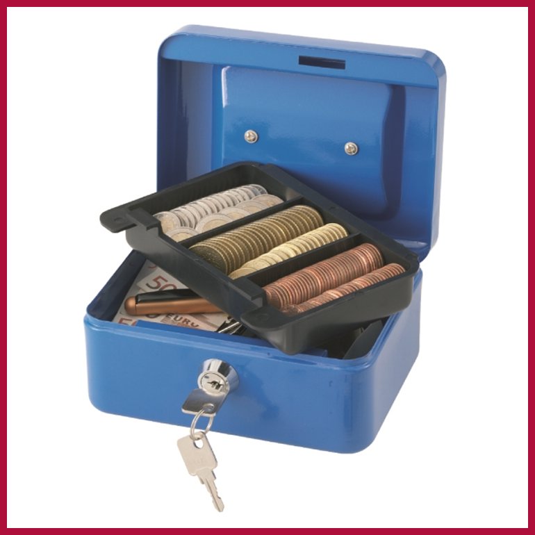 Sininen teräksinen kassalipas kolikkolokerolla on kestävä ja käytännöllinen ratkaisu käteisen säilytykseen. Kassalippaan sisällä on irrotettava muovinen kolikkolokerikko, joka helpottaa rahojen lajittelua ja käyttöä. Tukeva rakenne, kätevä kantokahva ja mukana tulevat 2 avainta tekevät lippaasta turvallisen ja helposti siirrettävän. Kompakti koko (255 x 200 x 90 mm) sopii erinomaisesti toimistoon, myyntipisteeseen tai tapahtumiin, joissa tarvitaan luotettava kassaratkaisu.