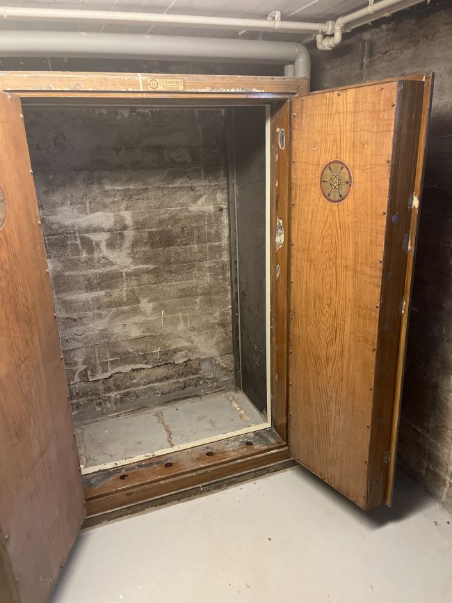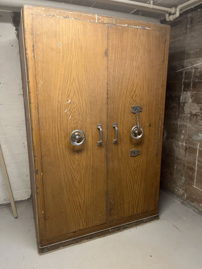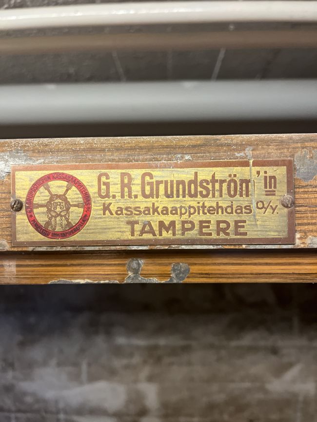 G.R.Grundström Kassakaappitehtaan holvin ovet / kassakaappi. Oma arvioni on, että kaappi olisi 1930-luvulta. Toiminut asekaappina talon aikaisemmalla asukkaalla. Hieno kaappi kaipaisi entisöintiä. Pitäisin itsekin, mutta ei oikein tahdo löytyä hyvää paikkaa. Nyt pitäisi siirtää pois remontin tieltä.