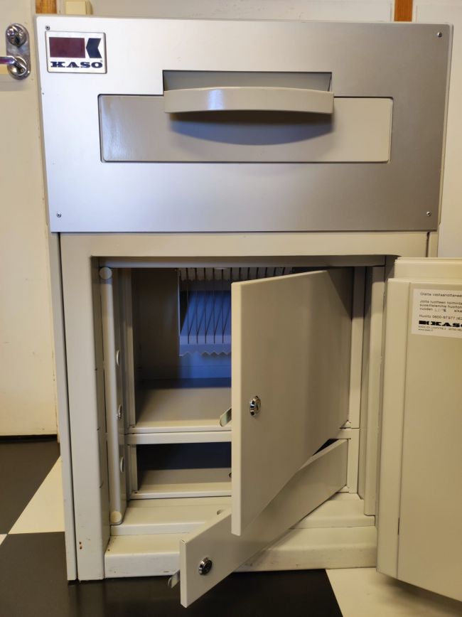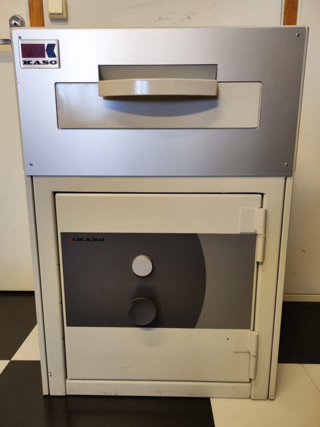 Hyväkuntoinen, yhdellä omistajalla ollut 2008 valmistettu Kaso 247 -kassakaappi. Kahdet avaimet, kaksi lukittavaa sisäosastoa, yösäilöluukku
