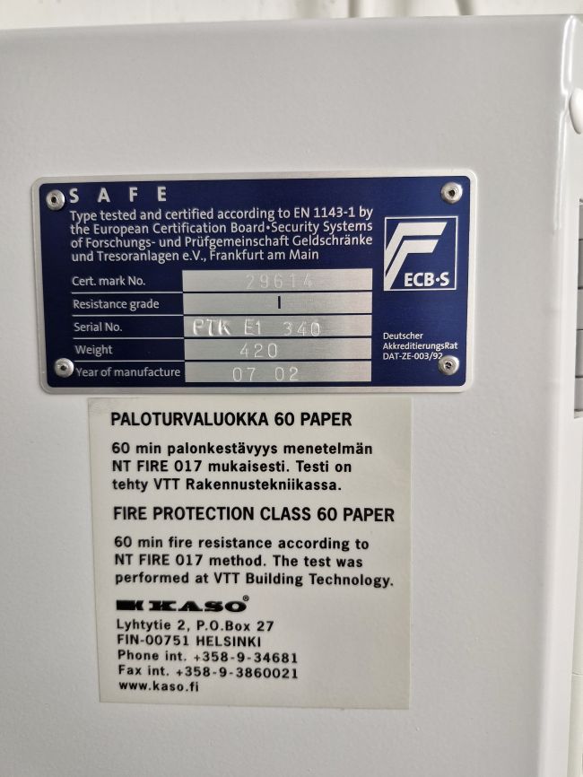 KASO paloturvakaappi mallia PTK E1 340, kahdella avaimella.